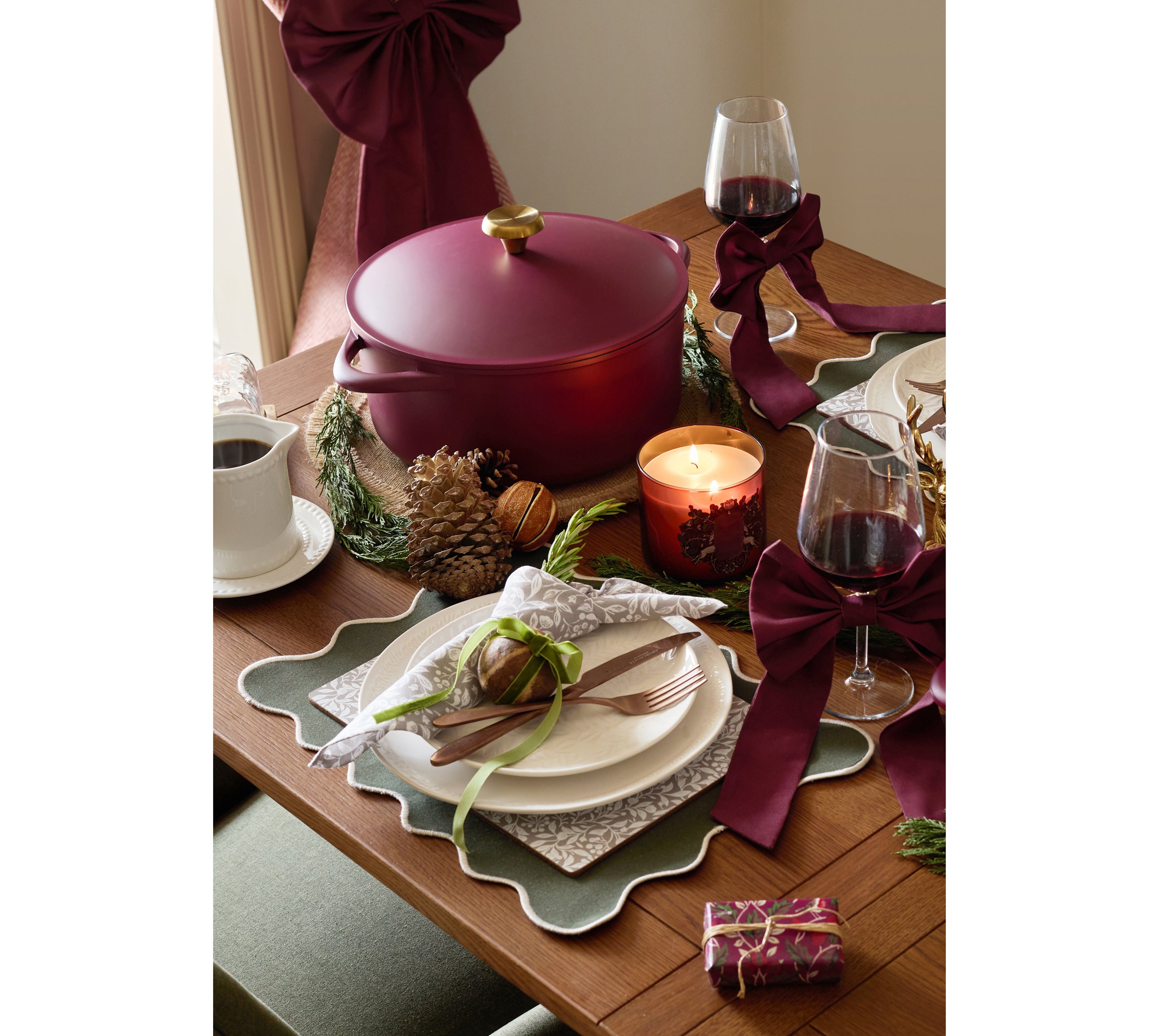 1. Cast Aluminium Casserole Dish in Burgundy, 2.7L, £35; Winter Berries Multi-Wick Candle, £8; rest of items from a selection, Dunelm