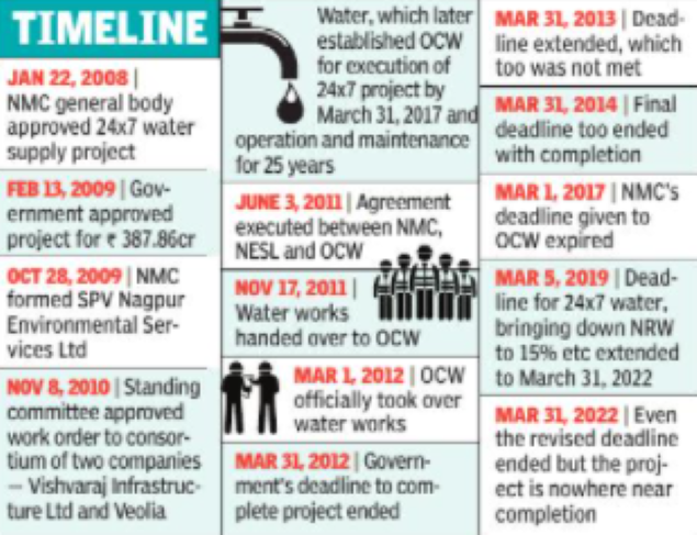 The central and state governments had sanctioned Rs1,100 crore between 2006 and 2009 for improving city water infrastructure, quantum of water, plugging leakages, curbing unequal water distribution, reducing non revenue water (NRW), mitigating contamination, etc. The NMC had set a deadline of March 31, 2017 for the OCW to convert all 68 command areas into 24x7, end contamination, ensure equal water distribution to all areas and bring down NRW to 15%. However, as per NMC data, the NRW is still over 40%.