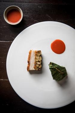 Smoked red tail, fish mousse, fermented coconut cream, pickled kale stems, kale crisp, fried betel leaves. 80/20 Bangkok