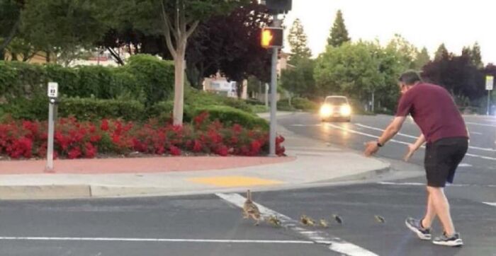 In May 2023, father-of-two, Casey Rivara, was k****d by a driver as he was trying to help a family of ducks cross the road in California. This photo was captured just moments before the tragedy.
