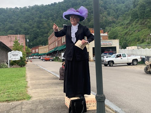 These parallels were readily apparent at the centennial celebration of the Battle of Blair Mountain, which I attended earlier this month in West Virginia. During a weeklong slate of talks, panels, and concerts across the cities of Charleston, Logan, and Matewan, performers reenacted critical moments from the seminal labor battle. In Matewan, Loretta Williams, a historical reenactor from Illinois, breathed new life into a famously rousing speech given by Mary “Mother Jones” Harris, a small, white-haired woman with round spectacles and a thick Irish brogue. Decked out in Harris’s signature old-fashioned black dress and wide-brimmed hat trimmed with ribbons, Williams stood atop a little wooden soapbox on a street corner and upbraided workers for not fighting hard enough to take what was rightfully theirs. “You are men of honor, respectable, decent, hard-working,” Williams-as-Harris hollered. “And you let them come in and rob you blind, and you never said a damn word about it!”