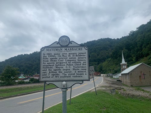 Matewan is a little pinprick of a town, just under two hours away from Charleston. But it bears the weight of a heavy historical burden. It was in Matewan that Baldwin-Felts detectives, the notorious “gunmen of capitalism” who terrorized workers and union sympathizers on the bosses’ orders, descended on the coal camps to evict a group of union mining families at gunpoint, and where the resulting conflict between miners and hired gun thugs led to bloodshed and death. The Mine Wars loom large over this small corner of a complicated state: From 1900 to 1921, miners and their families in the coalfields of southern West Virginia fought tooth and nail for the right to join unions. A multiracial, multiethnic group of white Appalachian mountaineers, Black workers who had migrated from the Deep South, and immigrant workers from Italy and Eastern Europe came together and repeatedly rose up against the coal barons and their goons in places like Matewan, and especially on Blair Mountain.
