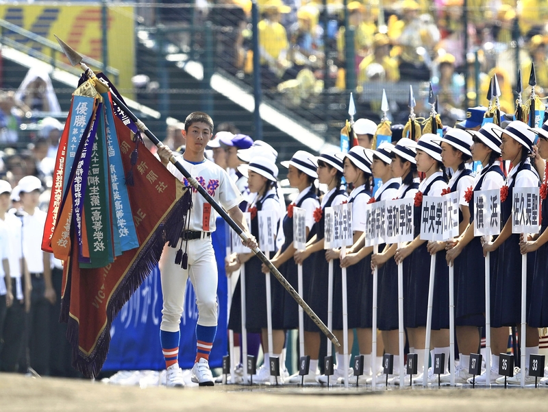 The captain of Hanasaki Tokuharu High School's baseball team carries the flag of the National High School Baseball Championship on Sunday during the opening ceremony of the 100th championship at Koshien Stadium in Nishinomiya, Hyogo Prefecture. The ceremony was attended by Crown Prince Naruhito and Crown Princess Masako, and saw a record 56 schools march into the stadium. Hanasaki Tokuharu, located in Saitama Prefecture, won the championship last year.