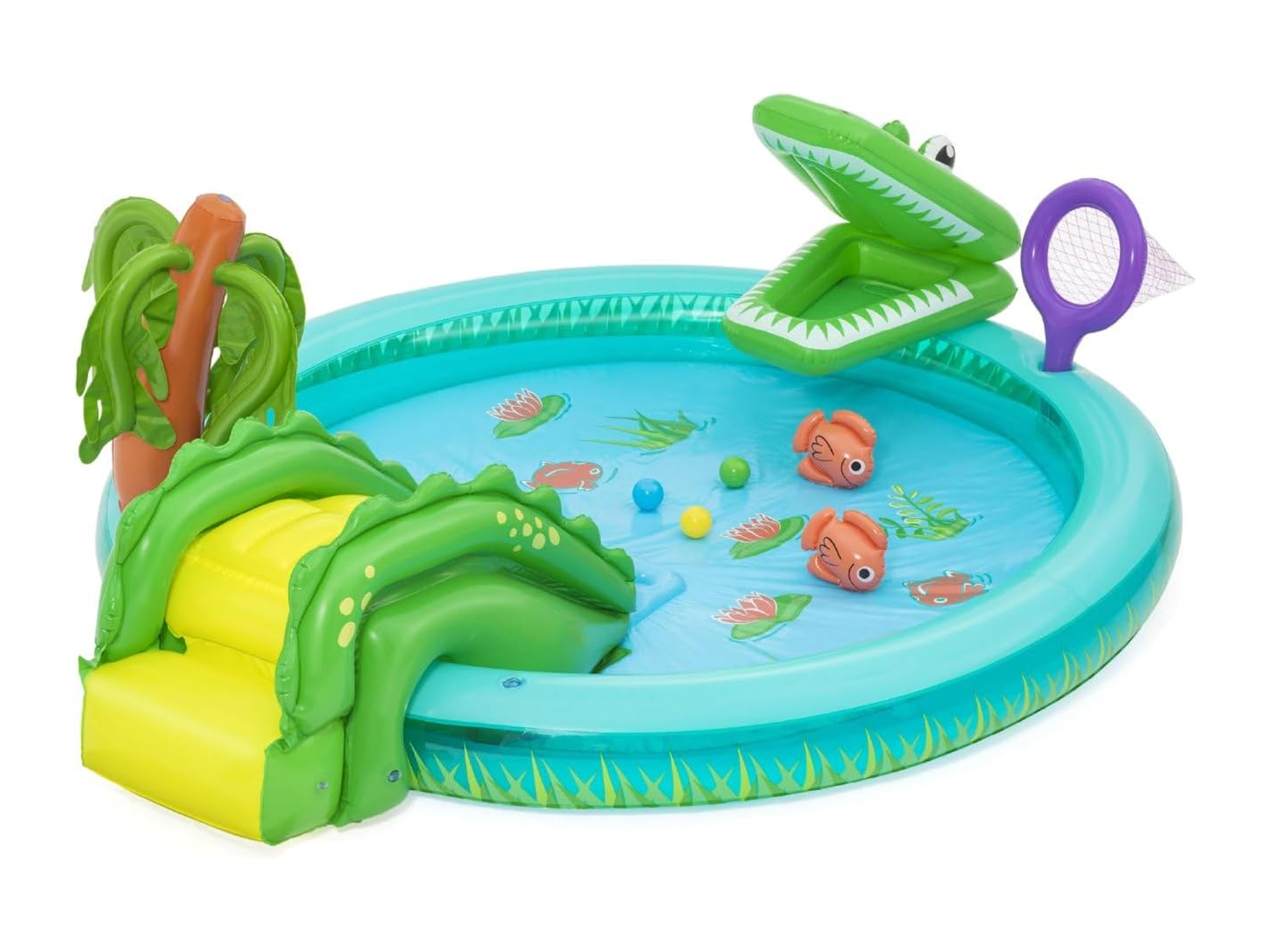 Quick and easy to inflate using an electric pump, the shallow design filled up quickly and warmed up fairly efficiently when exposed to the midday sun. Our two and 4-year-old testers loved all the additional accessories, scooping up the inflatable fish using the net and opening the crocodile's mouth to throw the balls inside.
