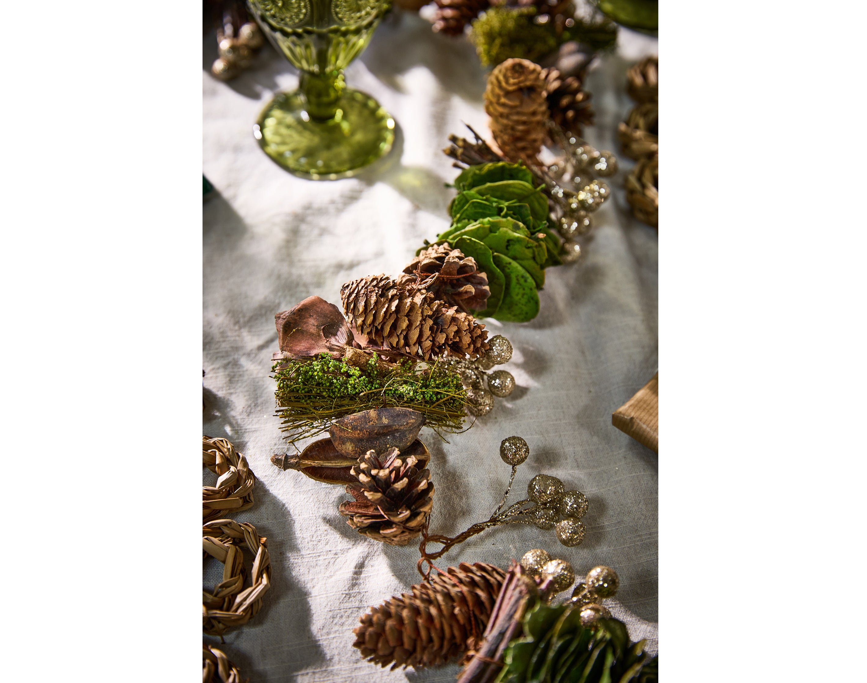 Perfectly placed for rustic settings and Scandi-style tablescapes, this pine cone garland makes a gorgeous centrepiece set against green goblets – and napkins tied with twine and sprig of spruce.