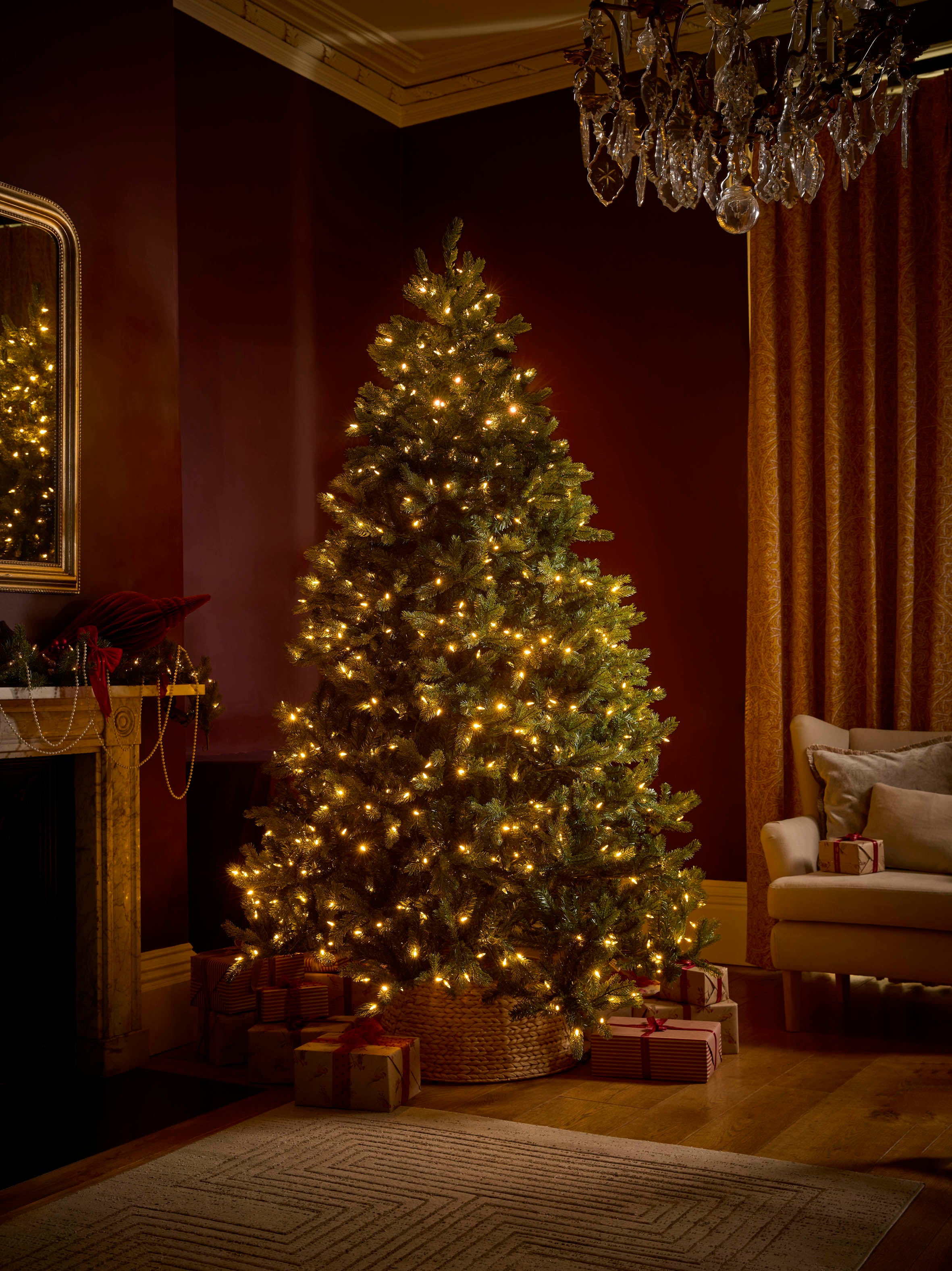 With enough razzle-dazzle to elevate your décor to the dizzy heights, this 8ft tree can be dressed from top-to-toe. Pre-lit with 800 vintage-style bulbs and 114 bushy branches to beautify with ornaments, it’s the business. A 7ft tree is also available.