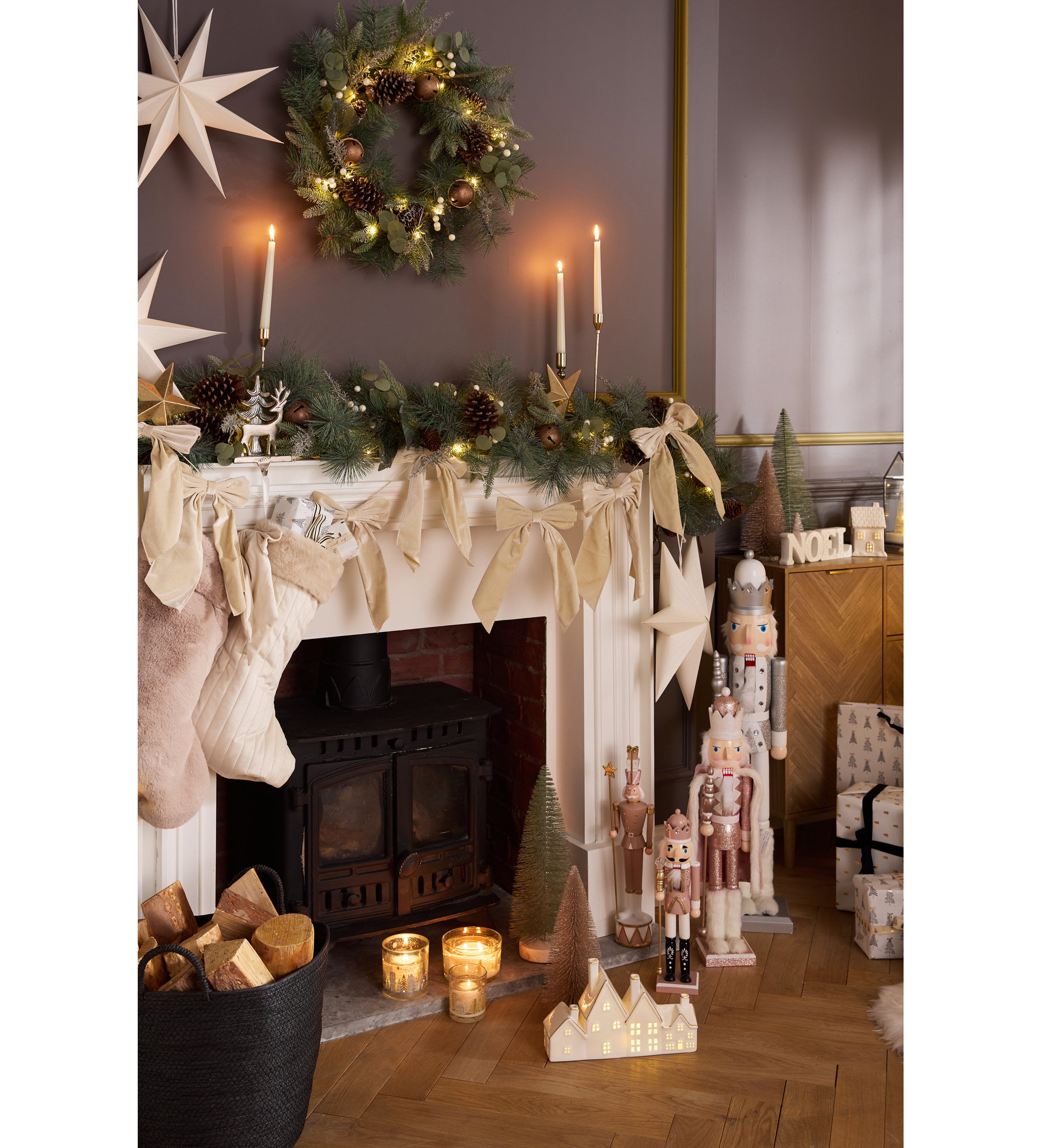 8. Pre-lit Wreath with Bells – 65cm, £25; Pre-lit Garland with Bells – 180cm, £25; Cream Bow Garland – 1.5m, £7; White Stars, £2 each; rest of items from a selection, B&M Home, in-store