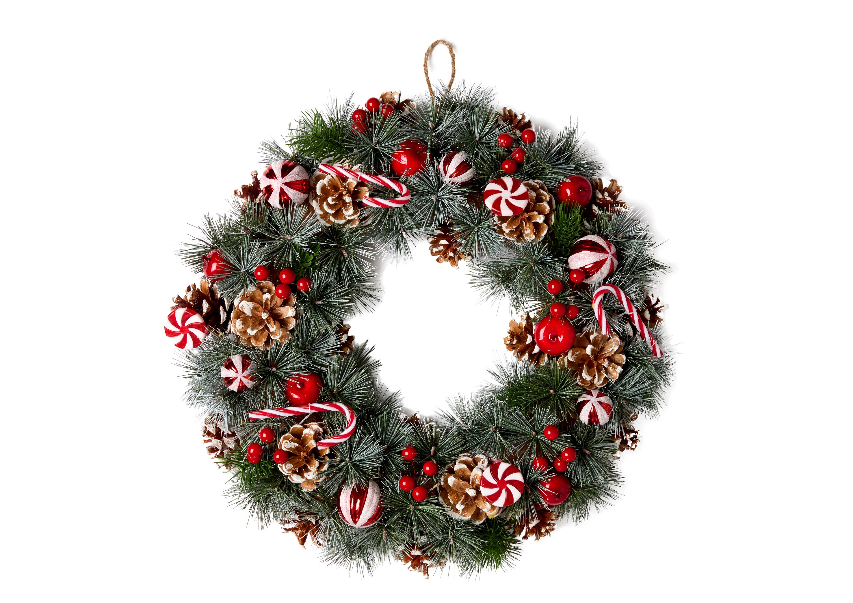 A sweet novelty wreath with its cute candy canes, crimson berries and baubles scattered with pretty pine cones, it’s one for fireside mantels and candy cane Christmas stockings. Matching garland available.