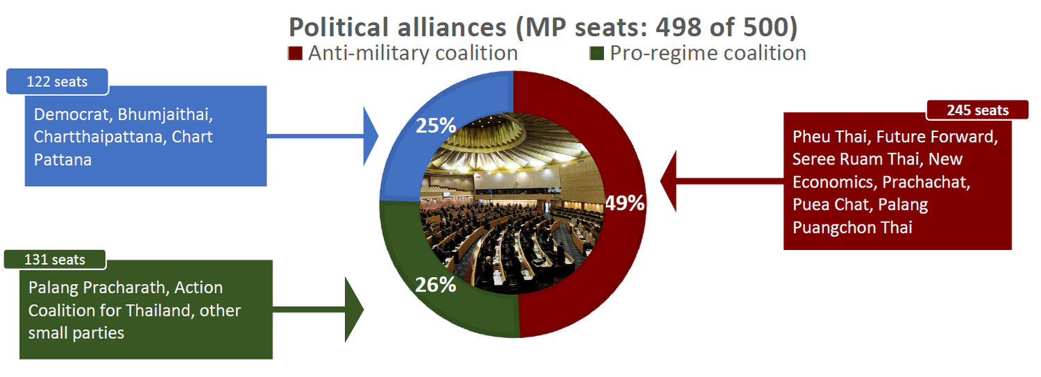 After the briefing on Monday, the pro-regime PPRP coalition now has 131 seats based on public shows of support so far. It is led by PPRP (115), Action Coalition for Thailand supported by former Democrat fixer and street protest leader Suthep Thaugsuban (5) and 11 small parties formally pledging their support on Monday (11).