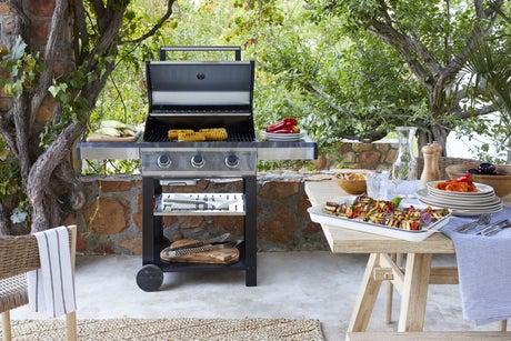 Cookouts may be casual, but you still want function and form. With a warming rack, two side shelves (one converts into a side burner), shelving, built-in thermometer and 19-piece tool set, this 4-burner gas barbecue is one for the BBQ king or queen.