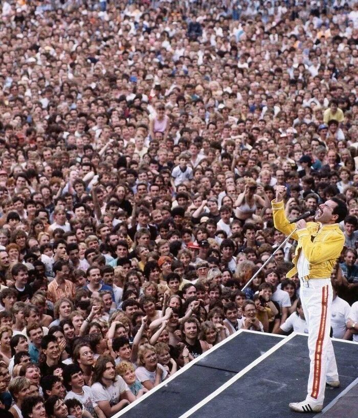 Freddy Mercury performing at Wembley, 1986