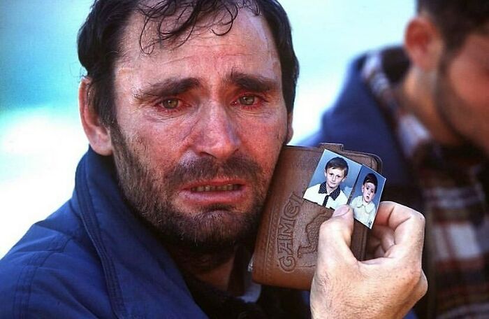 Mustafa Xaja, a Kosovar-Albanian, shows pictures of his children he fears have been killed during the war in Kosovo. He had just been released as a prisoner of the Serbs and forced to cross the border, becoming a refugee in Albania. Only after the the war did he discover that his family was alive and safe. 1999 Photo by Peter Turnley
