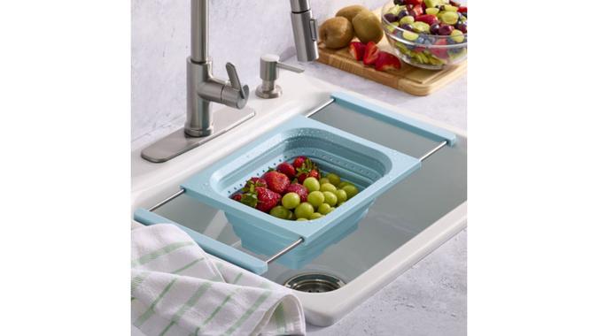 Rinse or drain up to four quarts worth of vegetables, fruits, pasta and more with the KitchenAid collapsible colander. This colander is designed to expand up to 22.5 inches across sinks, and can be easily cleaned and collapsed once more for storage when not in use.