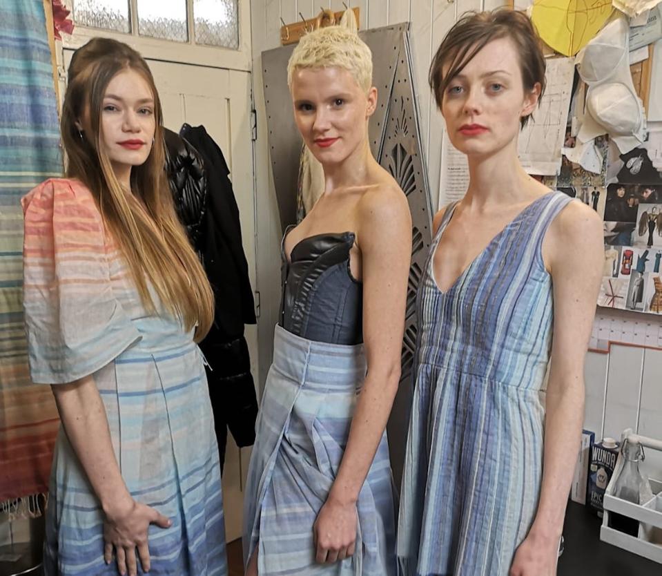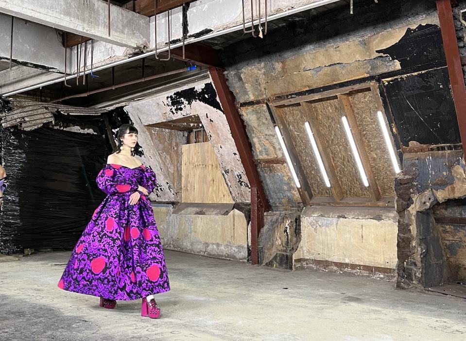 Edward Crutchley presented 21 dramatic looks in an industrial warehouse, the Bargehouse beside the River Thames. A mix of haute couture and edgy designs, some with a Victorian feel, use a clever variety of fabrics. Collection highlights include voluminous full length dresses, a periwinkle blazer and jackets in crushed velvet plus eye catching shirts and knit pieces in moth wing prints. Sportswear pieces in crushed purple and pink velvet and a tube dress spotted with carefully placed Swiss cheese holes added to the drama of a brilliant runway show.