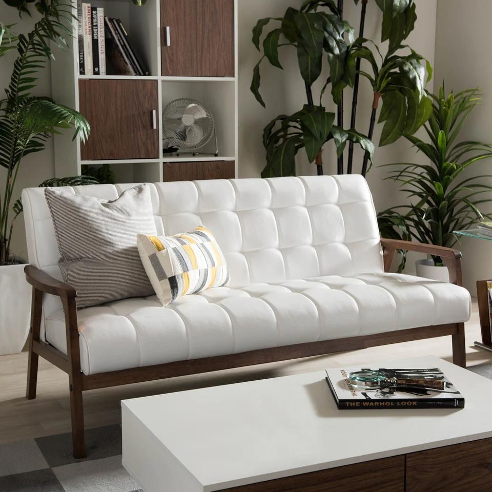 Looking for a mid-century modern silhouette? This faux leather sofa will fit your fancy. It measures just over five feet long and is designed to comfortably seat up to three people. And don’t worry about any stains. The faux leather finish is easy to clean using warm water and a soft cloth.
