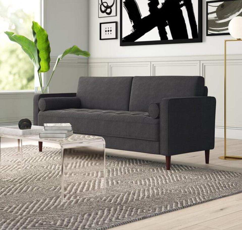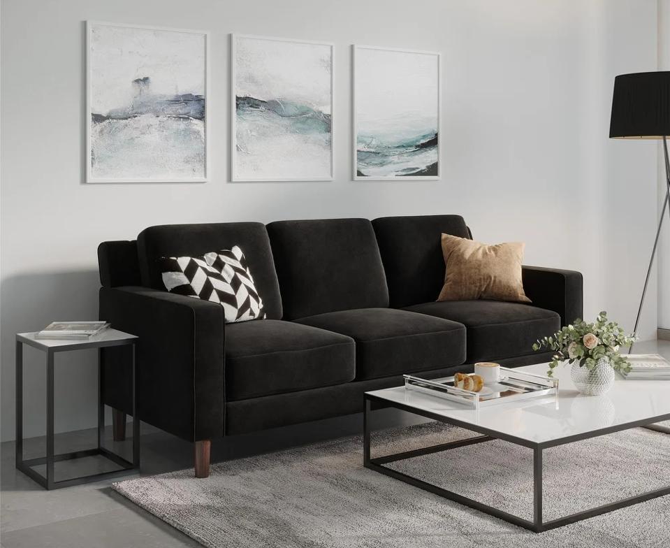 If you can’t get your mind off the year’s velvet sofa trend, here’s another excellent option that comes in black and gray. This square-armed sofa doesn’t have tufting, which makes it a bit more modern than other velvet sofas in this roundup.