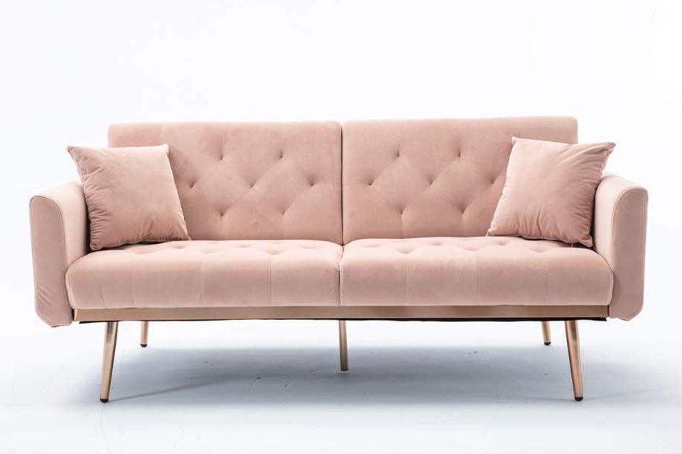 Here’s a truly chic, affordable sofa. It sits atop stunning gold metal feel and is available in both smooth and tufted options, not to mention eight gorgeous colors. The teal and olive green versions? They’re bound to earn you endless compliments from all your guests.