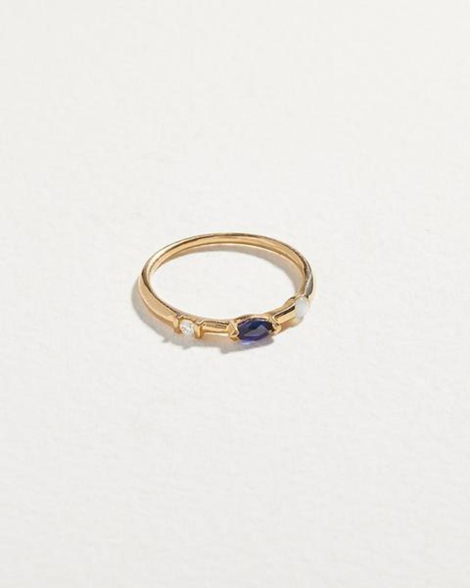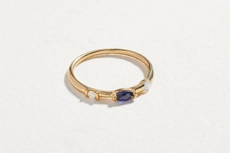 Pamela Love’s Multi Stone Sapphire Ring is ideal for those who love jewelry they can wear daily. The piece has just enough detail to stand out all while remaining beautifully minimal. The 14k gold ring features an oval cut sapphire that’s set horizonally, with a diamond on one side and a pearl on the other.
