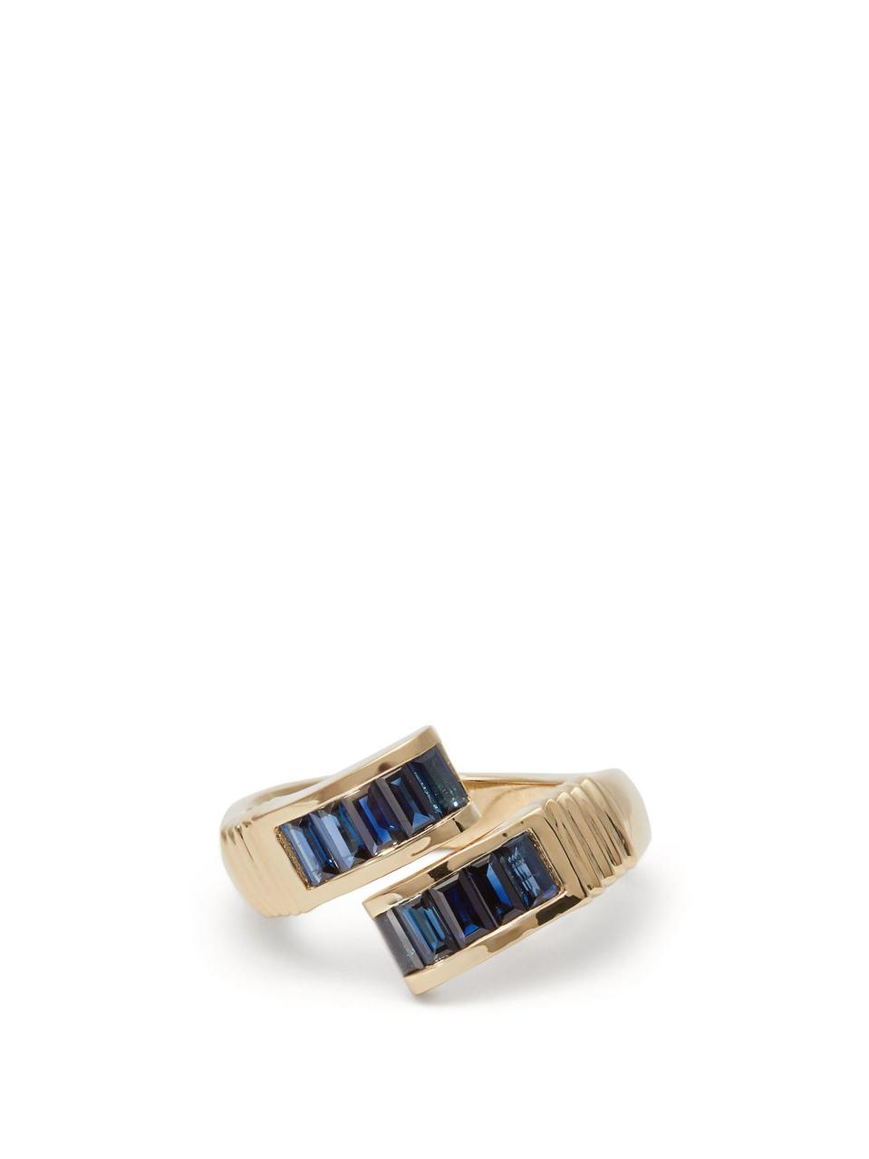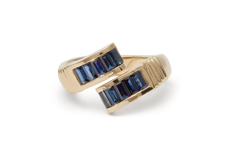 Retrouvaí’s heirloom-inspired designs are as beautiful as they are unique. The blue sapphire buckle ring features a wrap design that twists around its wearer’s finger in the most eye-catching of ways. Handmade in LA, the 14kt gold band is adorned with ten baguette-cut sapphires, for a total weight of 1.5 carats. The engraved band adds the vintage touch that Retrouvaí has become known for.