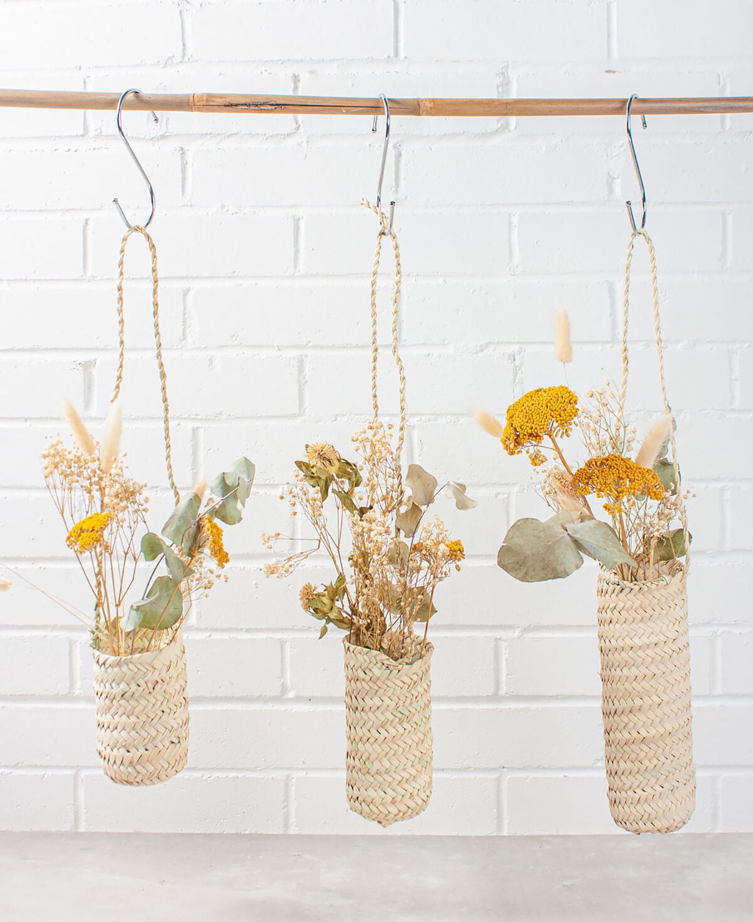 Artfully placed on a metal pot and pan rail or utensil rack, these handmade hanging baskets can be filled with dried flowers for a Mediterranean kitchen vibe.