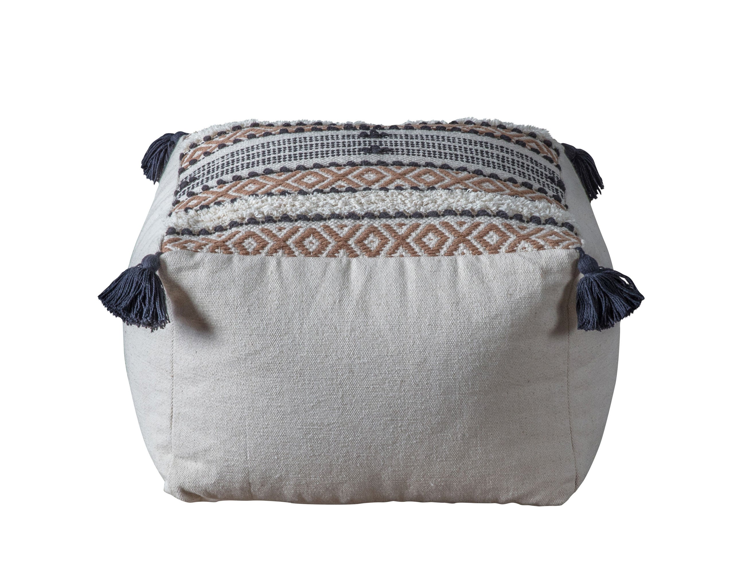 With its artisan design and blue tassels for a little global allure, this Moroccan inspired pouffe is contemporary and timeless.