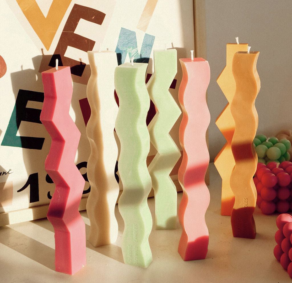 Colourful, squiggly candles are a thing, and a firm favourite in statement shelfies, topsy-turvy tablescaping and fun colour schemes.