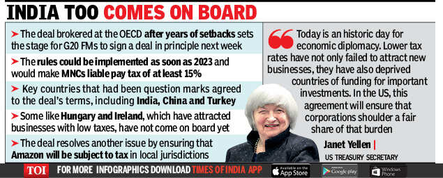 NEW DELHI: The world took a big step toward sweeping changes to global taxation as 130 countries and jurisdictions endorsed setting a minimum rate for corporations along with rules to share the spoils from multinational firms like Facebook Inc. and Alphabet Inc.’s Google.