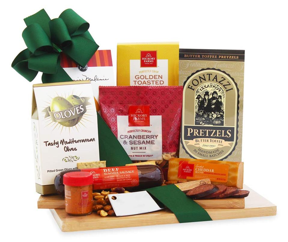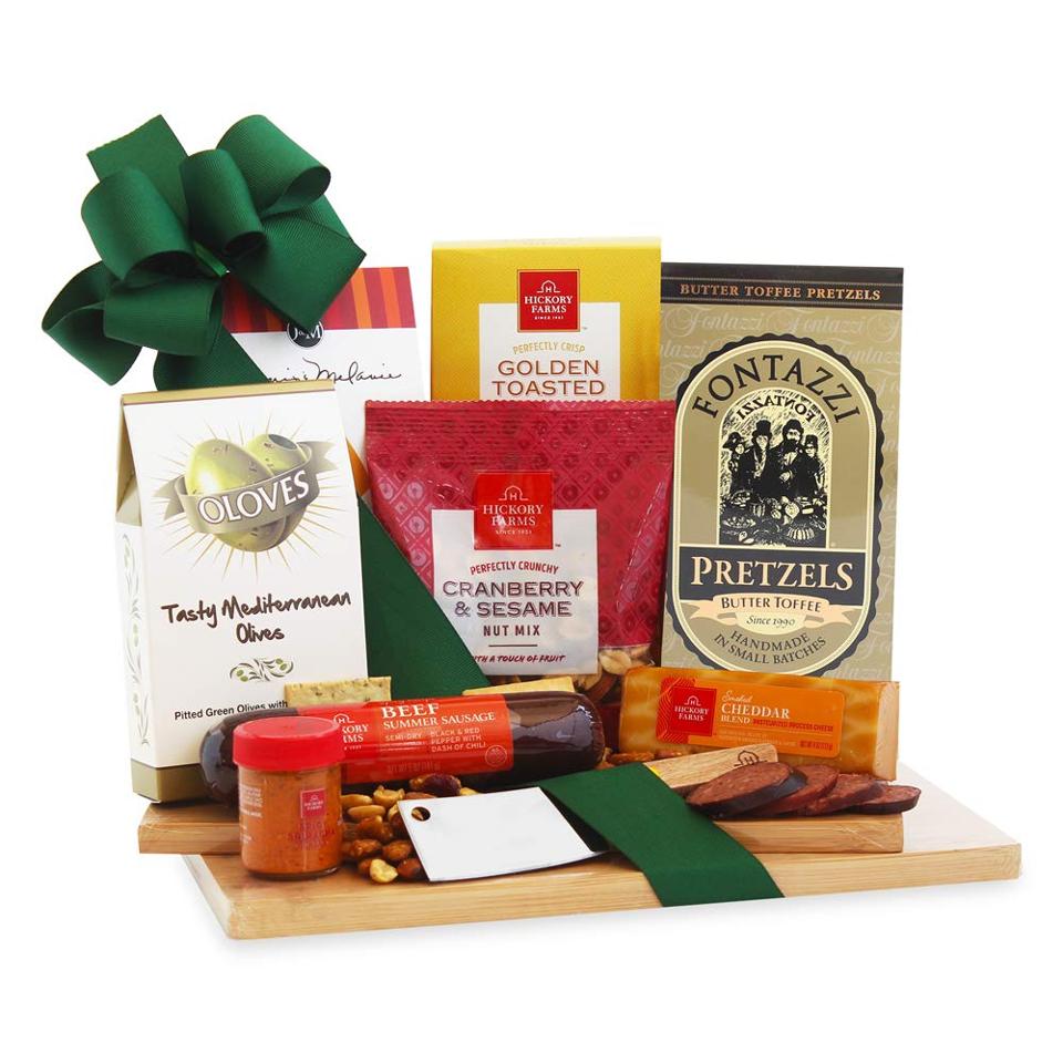 This gourmet cheese board is like a Friday afternoon happy hour delivered to their door (with next day shipping, conveniently). The wooden cutting board comes loaded with hors d’oeuvres, including cheddar cheese, crackers, butter toffee pretzels, savory sausage and chocolates.