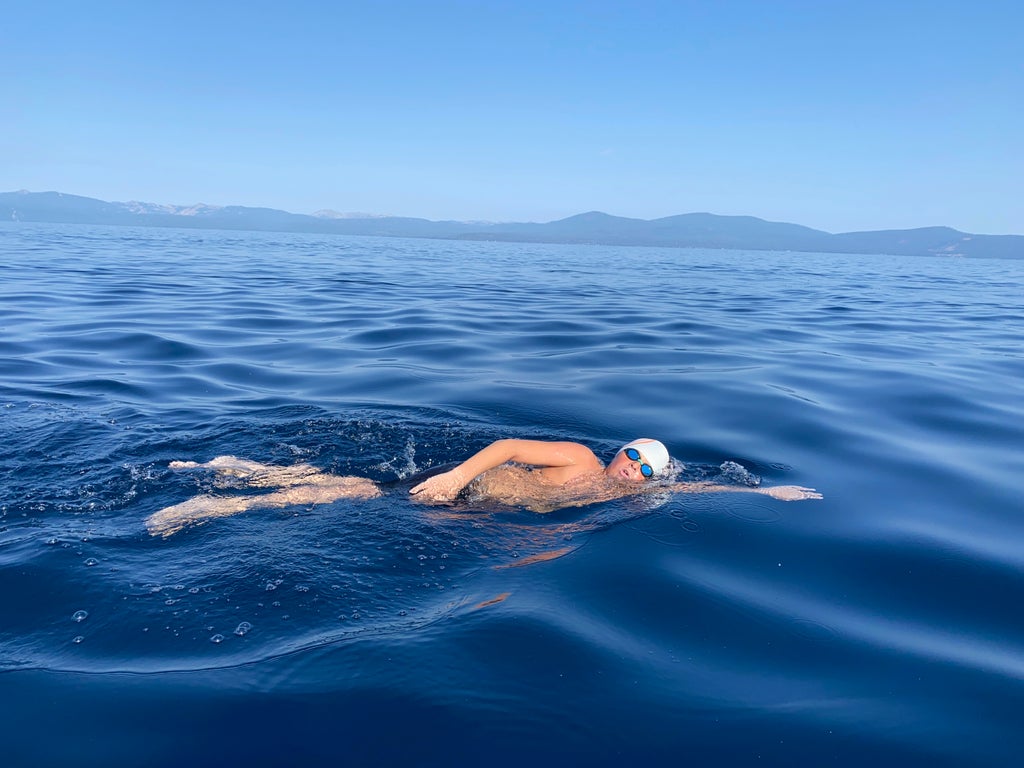 The latest swim was piloted by Captain Tom “Reptile” Linthicum of Lake Tahoe Marathon Swim Federation. The team also included an official observer and pace swimmer. Jillian Savage served as kayaker for the trip.