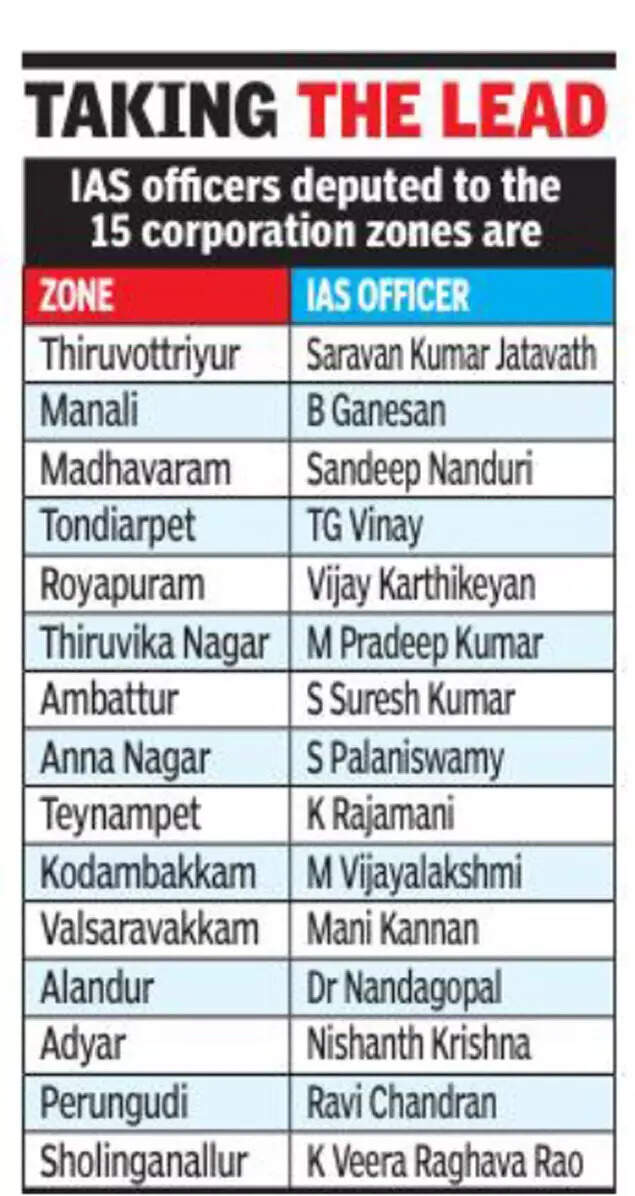 CHENNAI: The corporation has deputed one IAS official each for its 15 zones to monitor Covid-19 norms enforcement, carry out regular inspections at clusters, and visit tele-counselling and screening centres.