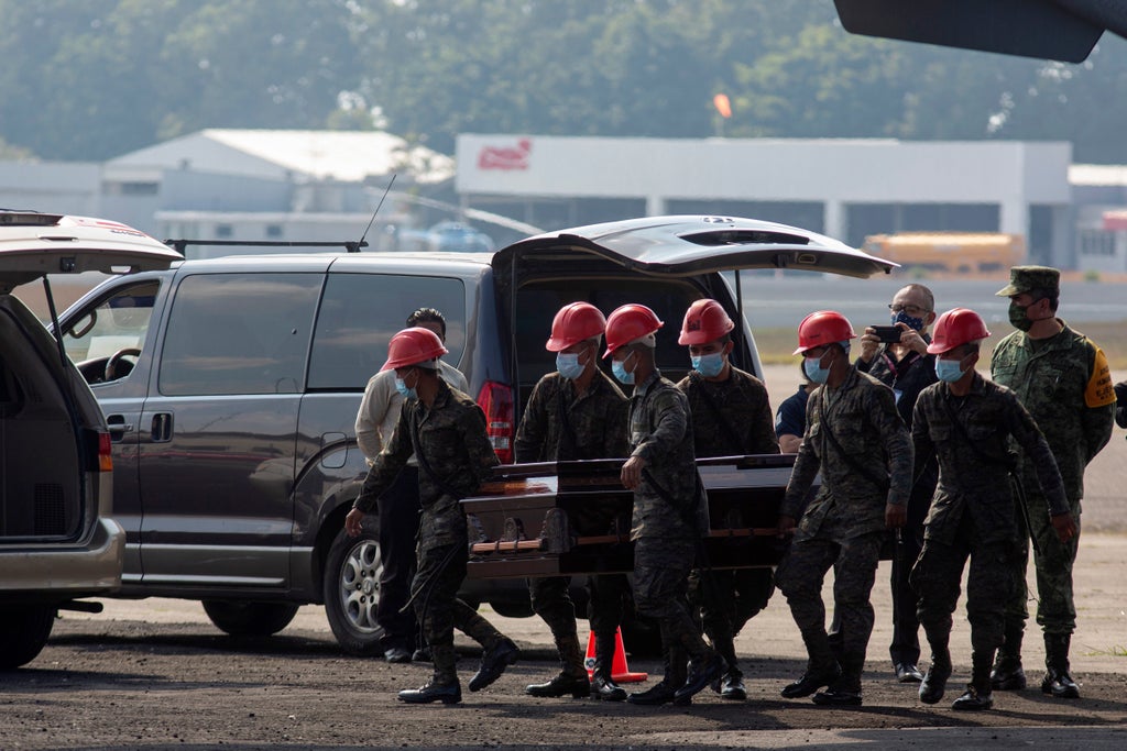 The remains in brown wood-colored coffins were delivered by a Mexican military C-295 transport aircraft.