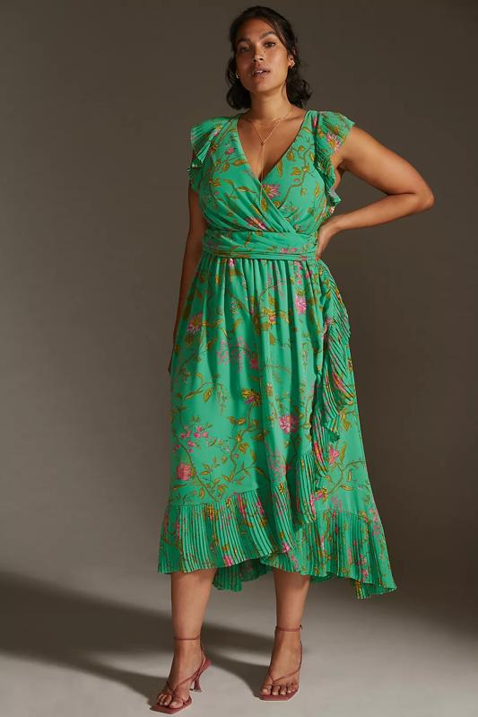This floral dress combines ruffled cap sleeves with chic midi-length wrap skirt and high waist. The print is also sophisticated enough with rich botanical tones to work for daytime as well as evening events—just pair with a cashmere wrap.