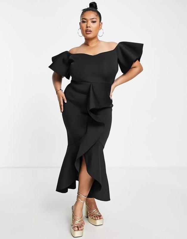 This dress is cut from ultra-smooth and stretchy scuba-style fabric for a body-shaping fit. The silhouette is off the shoulder with a frill front, high-low hem and wrap-style skirt, which creates a flattering effect. Only limited sizes are left so it’s worthwhile to shop quickly or check out other styles from the True Violet collection.