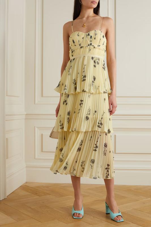 Self Portrait’s dresses combine beautiful prints with rich fabrics, creating pieces that you can wear day or night, in formal or casual settings. The yellow tone of this tiered dress is soft and feminine and the pleated, lightweight chiffon is great for summer but can be layered under a blazer on chilly days.