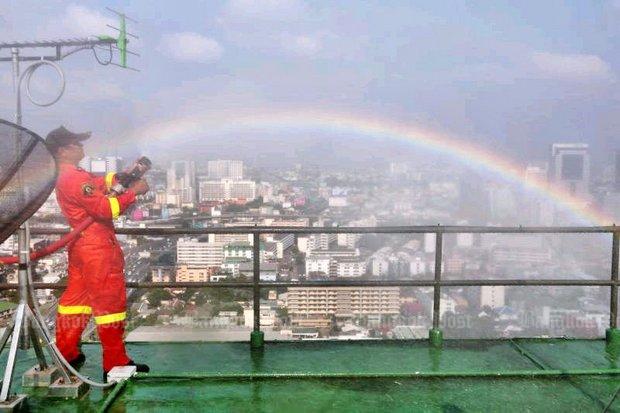 The city's latest effort to bust the dust was revealed by Vallop Suwandee, chief adviser to the Bangkok governor as he inspected water spraying on the rooftop of the 30-storey Lumpini Suite Din Daeng-Ratchaprarop Condominium in Din Daeng district Thursday morning.