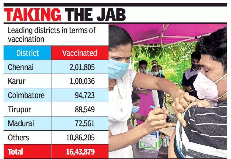 CHENNAI: Tamil Nadu’s second mass vaccination drive saw 16.34 lakh people take the jab on Sunday, more than five times the daily average. But it was much less than the 28.91 lakh vaccinated in last Sunday’s special drive.