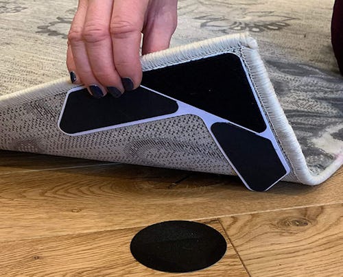 Keep your area rugs securely on the ground, thanks to these hook-and-loop rug corners. They efficiently and discreetly keep corners flat on the floor (where they belong), instead of curling up and creating a tripping hazard. The set includes four V-shaped pieces that stick to the rug — not the floor.