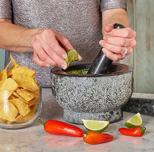 Make at-home guacamole the right way with this chic mortar and pestle set. Made from heavy-duty stone and granite, it has a 2-cup capacity and features a non-absorbent surface for added longevity. The textured interior helps you perfectly mash and muddle your ingredients to your desired consistency. Use it to crush herbs and nuts, too.