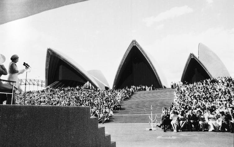 By 1973, Indigenous Australians were given a more significant role in the royal tours. Aboriginal actor Ben Blakeney, one of Bennelong’s descendants, gave the official welcome during the opening of the Sydney Opera House, and the then unknown actor David Gulpilil was among those performing a ceremonial dance.