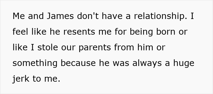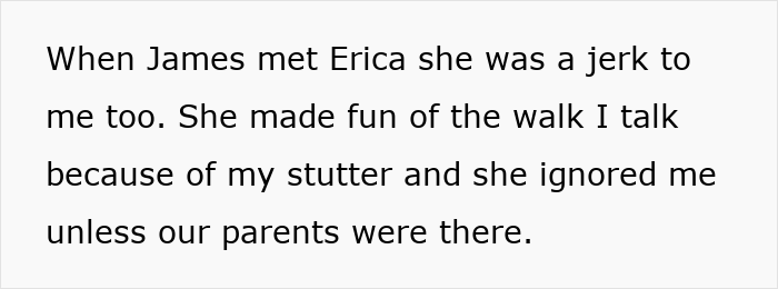 When his elder brother met Erica, OP was stuck with another person who was a jerk to him, making fun of the way he spoke with a stutter. Well, his parents had a bad relationship with James about how he treated OP. However, they made up and remained close even when he didn’t invite the poster to his wedding. As life went on, James and Erica almost pretended like the teen didn’t exist.