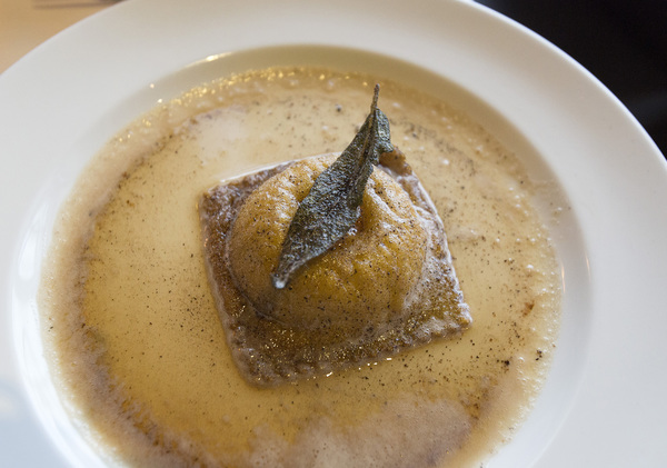 At a table in the corner of a back room, Conant asks the server to recommend some pastas, commencing a feast that will include salumi, prosciutto-wrapped grissini with truffle butter, not a few items from Silverton's mozzarella bar _ and pasta. The bucatini all' Amatriciana arrives in a deep red swirl; the ricotta gnudi are surrounded by garlic scapes and English peas; the ricotta and egg raviolo comes as a single pillow of ricotta and egg swimming in browned butter; and each strand of tagliatelle is perfectly coated with a rich oxtail ragu.
