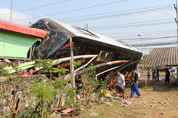 The double-decker bus was travelling from Bangkok to the Cambodian border at Aranyaprathet with 19 people aboard when it veered off the road and struck a house being used as the office of a construction firm at 8.40am, said Pol Lt Col Somchai Yura, a duty officer with the Watthana Nakhon police.