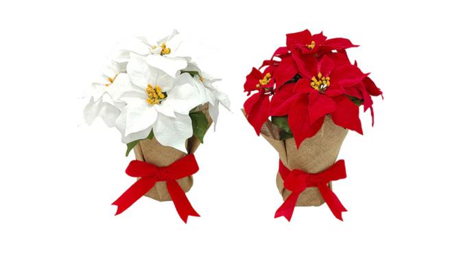 Fresh poinsettias tend to be costly, so pick up an affordable faux poinsettia in red or white to enjoy for months on end. Each faux holiday plant comes in a burlap pot tied up with a red ribbon.