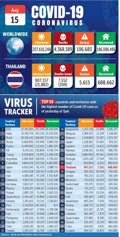 Thailand logged 182 more Covid-19 fatalities and 21,157 new cases over the previous 24 hours, the Public Health Ministry reported on Monday morning.