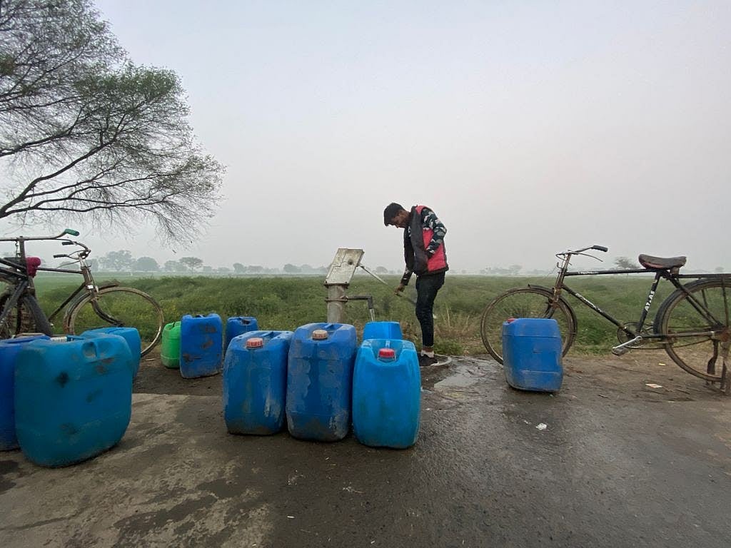 महानवई गांव में प्रवेश करते ही एक मंदिर है. मंदिर के बगल में तीन सरकारी हैण्डपंप लगे हुए हैं, जिनमें से दो खराब हैं. गांव के कुछ लोग यहां पानी भरने आते हैं. मंदिर से आगे बढ़ने पर सड़क किनारे दो और पंप नजर आते हैं. इसमें से भी एक खराब है. यहां हमारी मुलाकात 22 वर्षीय छोटे खान से हुई. खान पानी भर रहे थे.