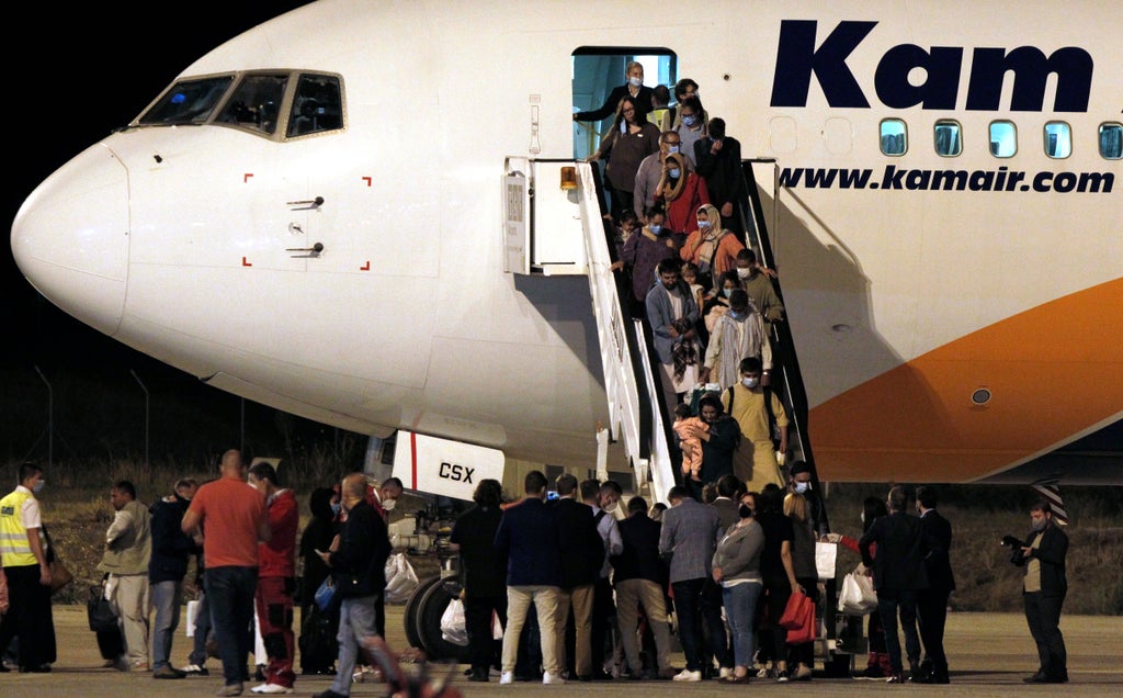 A first group of 149 Afghan evacuees landed late Monday in North Macedonia, where they will stay for a few months pending resettlement elsewhere.