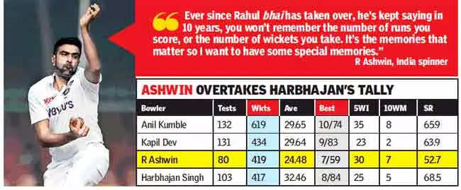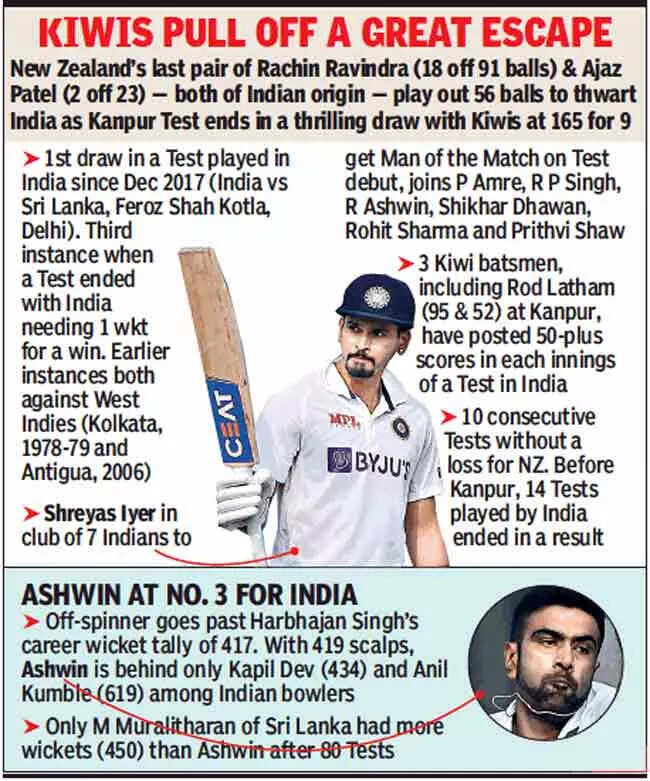 Ravindra and Ajaz's rear-guard partnership took the sheen off Ashiwn's moment of going past Harbhajan Singh as India's third highest wicket-taker for India in Test cricket. New Zealand's 165/9, after having played out 90 overs in the day, meant the two teams ended up getting four World Test Championship points each from the first Test with one more Test to go in Mumbai later this week.