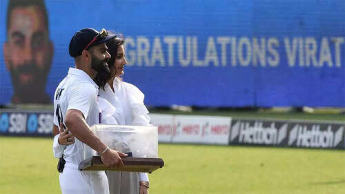 <p>Virat Kohli with his wife Anushka Sharma at the felicitation for his 100th Test in Mohali. (AFP Photo)</p>7/10:Test debut