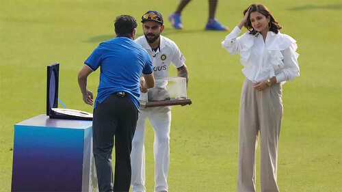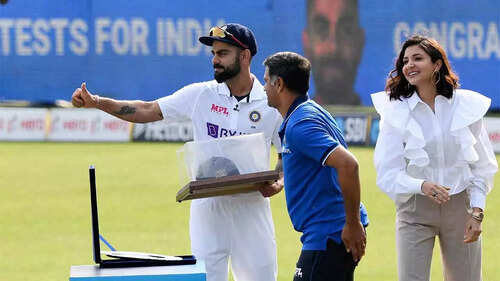<p>Virat Kohli is felicitated for his 100th Test by India's coach Rahul Dravid as his wife Anshuka Sharma watches in Mohali. (AP Photo)</p>5/10:Felicitation ceremony