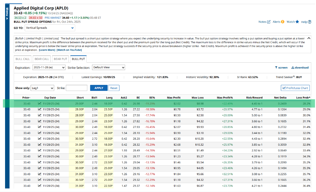 So, according to the screener results, you can sell an OTM bull put spread on APLD by selling a 29-strike put for $2.44 and buying an 18-strike put for 42 cents per share, bringing your total net credit to $2.02 per share or $202 per contract.